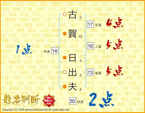 古(5画)賀(12画) 日(4画)出(5画)夫(4画)