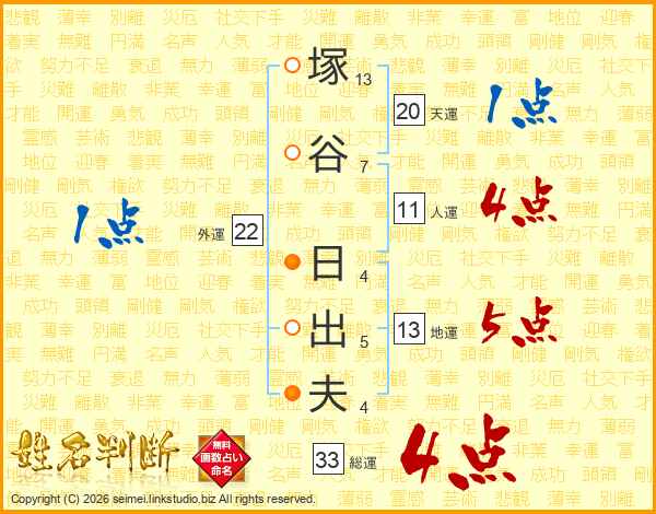 塚(13画)谷(7画) 日(4画)出(5画)夫(4画)