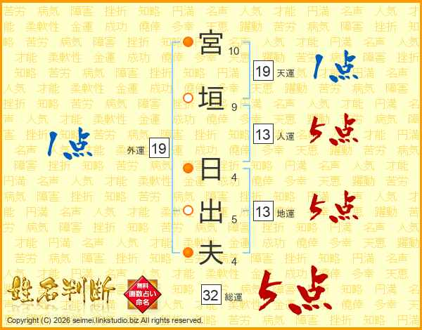 宮(10画)垣(9画) 日(4画)出(5画)夫(4画)