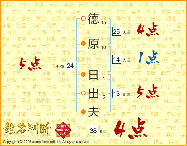 徳(15画)原(10画) 日(4画)出(5画)夫(4画)