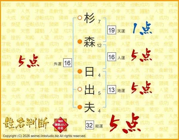 杉(7画)森(12画) 日(4画)出(5画)夫(4画)