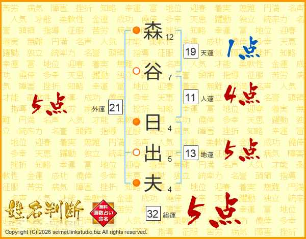 森(12画)谷(7画) 日(4画)出(5画)夫(4画)