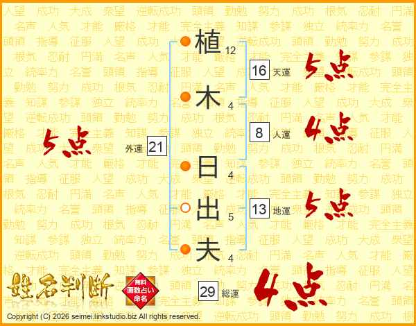 植(12画)木(4画) 日(4画)出(5画)夫(4画)