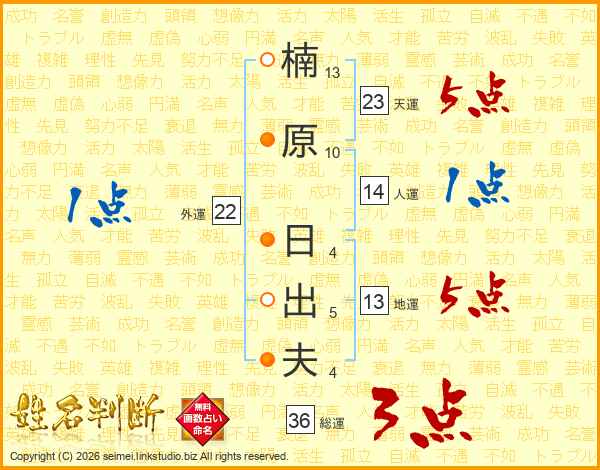 楠(13画)原(10画) 日(4画)出(5画)夫(4画)