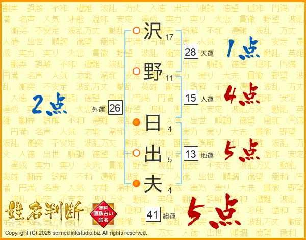 沢(17画)野(11画) 日(4画)出(5画)夫(4画)