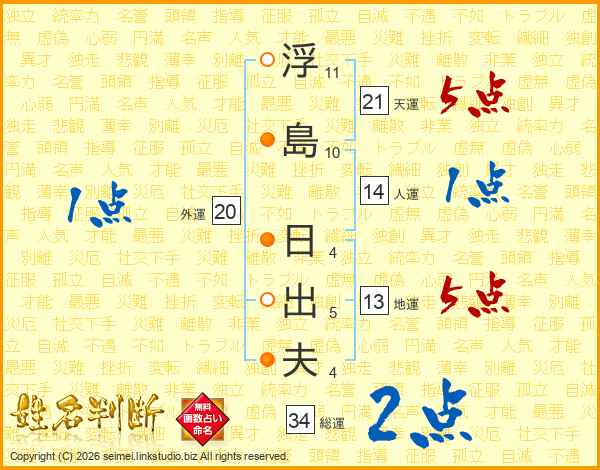 浮(11画)島(10画) 日(4画)出(5画)夫(4画)