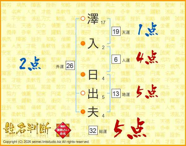 澤(17画)入(2画) 日(4画)出(5画)夫(4画)