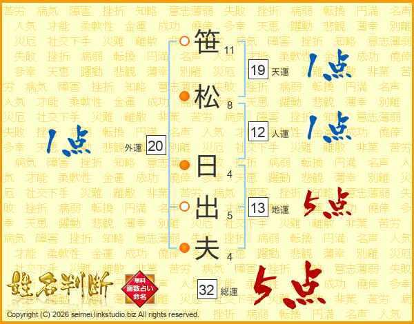 笹(11画)松(8画) 日(4画)出(5画)夫(4画)