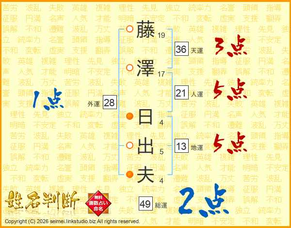 藤(19画)澤(17画) 日(4画)出(5画)夫(4画)