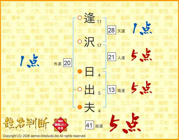 逢(11画)沢(17画) 日(4画)出(5画)夫(4画)