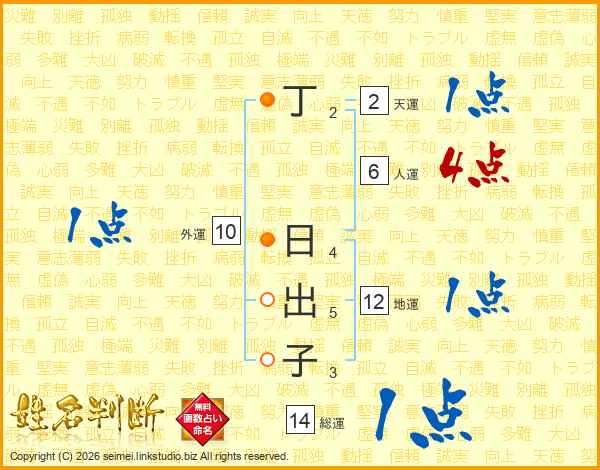 生活面を象徴する運勢です。外部から受ける影響力を表し、結婚運、家庭運や職場、環境への順応性を表します。総運から人運を引いた画数。姓や名が1文字の場合を除く。