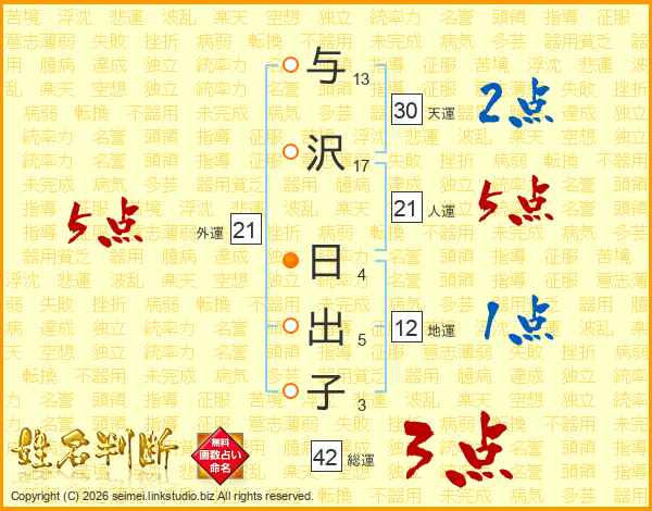 与(13画)沢(17画) 日(4画)出(5画)子(3画)