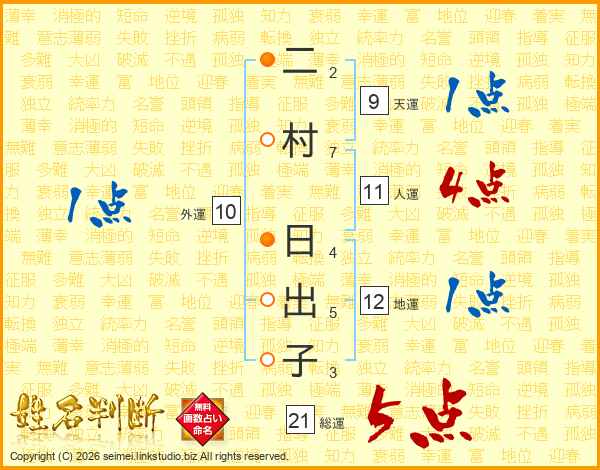 二(2画)村(7画) 日(4画)出(5画)子(3画)