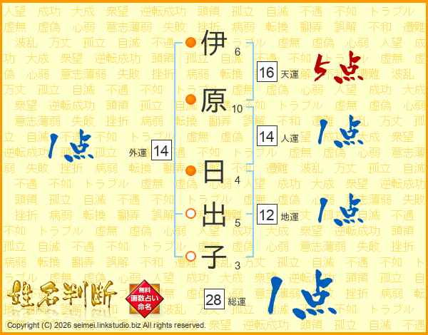 伊(6画)原(10画) 日(4画)出(5画)子(3画)