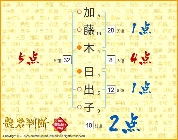 加(5画)藤(19画)木(4画) 日(4画)出(5画)子(3画)