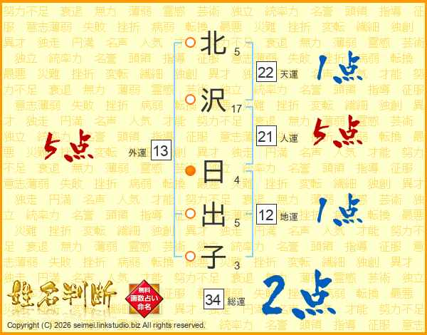 北沢日出子さんの人運は21画の5点!