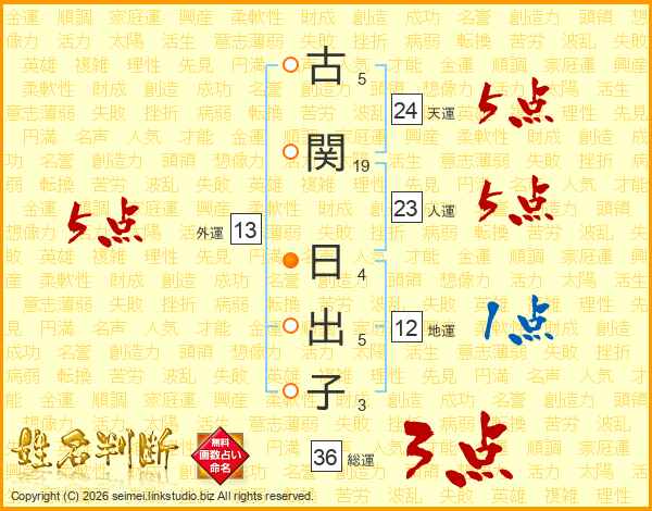 古(5画)関(19画) 日(4画)出(5画)子(3画)