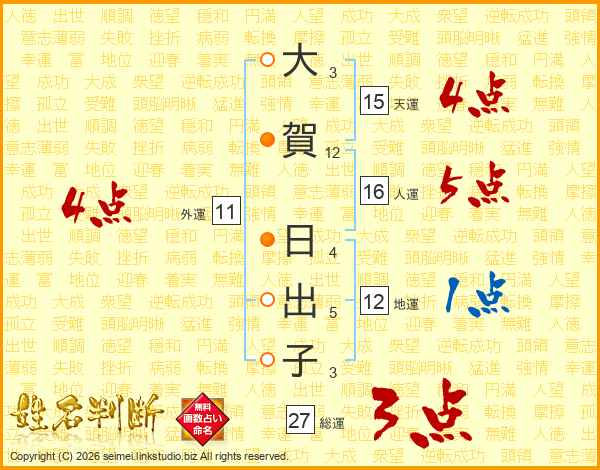 大(3画)賀(12画) 日(4画)出(5画)子(3画)