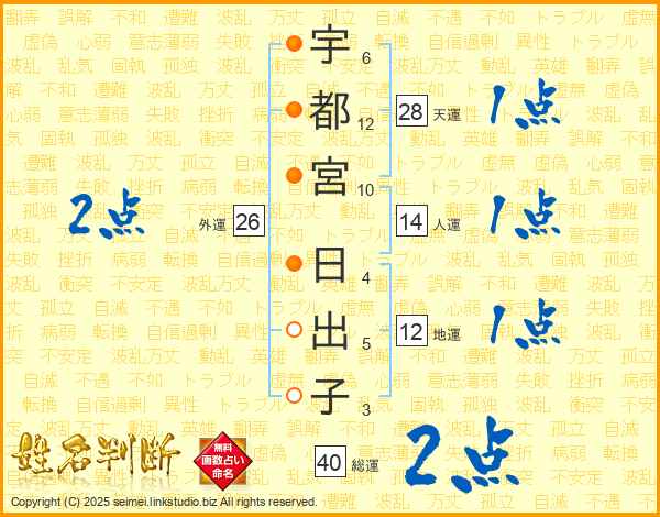 宇(6画)都(12画)宮(10画) 日(4画)出(5画)子(3画)