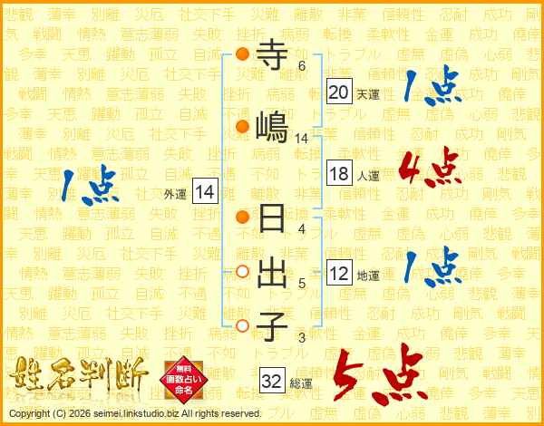 寺(6画)嶋(14画) 日(4画)出(5画)子(3画)