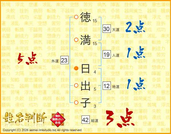 徳(15画)満(15画) 日(4画)出(5画)子(3画)