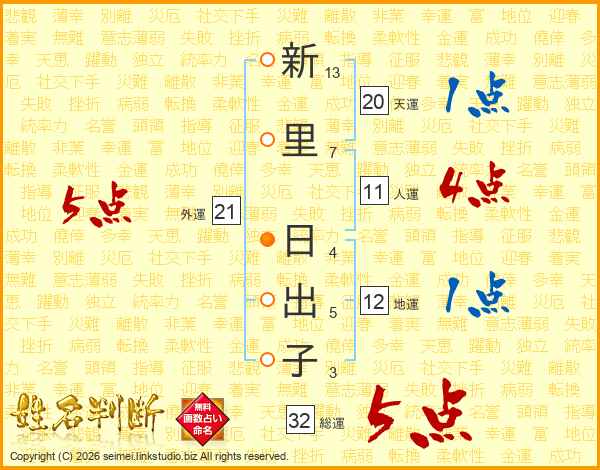 生活面を象徴する運勢です。外部から受ける影響力を表し、結婚運、家庭運や職場、環境への順応性を表します。総運から人運を引いた画数。姓や名が1文字の場合を除く。