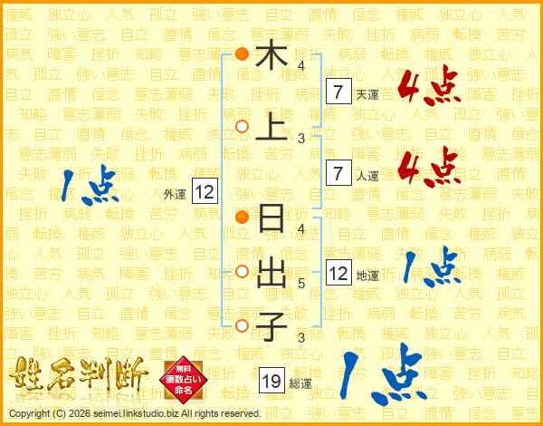 木(4画)上(3画) 日(4画)出(5画)子(3画)