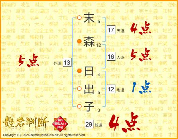 末(5画)森(12画) 日(4画)出(5画)子(3画)