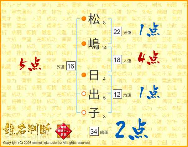 松(8画)嶋(14画) 日(4画)出(5画)子(3画)