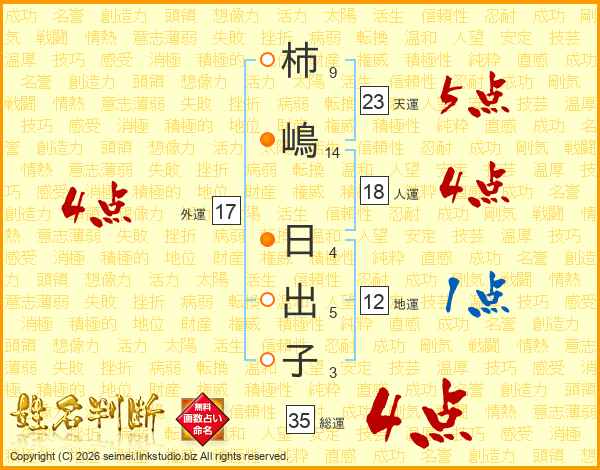 柿(9画)嶋(14画) 日(4画)出(5画)子(3画)