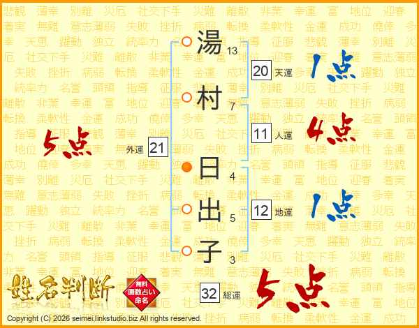 湯村日出子さんの総運は32画の5点!