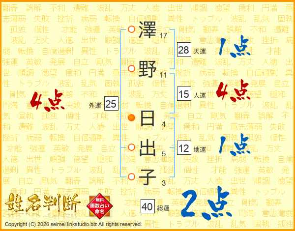 澤(17画)野(11画) 日(4画)出(5画)子(3画)