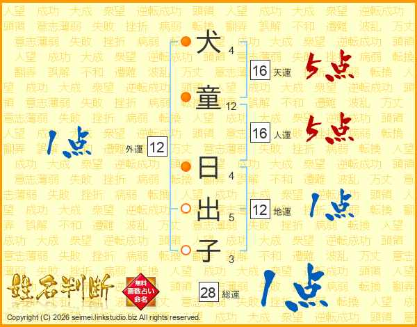 犬(4画)童(12画) 日(4画)出(5画)子(3画)