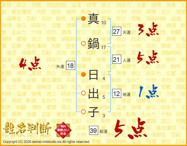 真(10画)鍋(17画) 日(4画)出(5画)子(3画)
