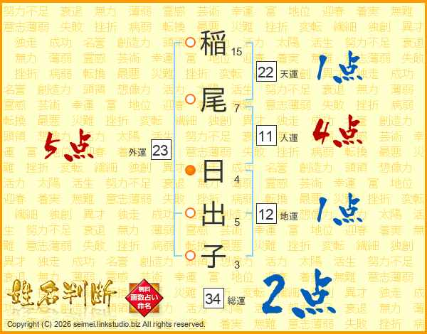 稲(15画)尾(7画) 日(4画)出(5画)子(3画)
