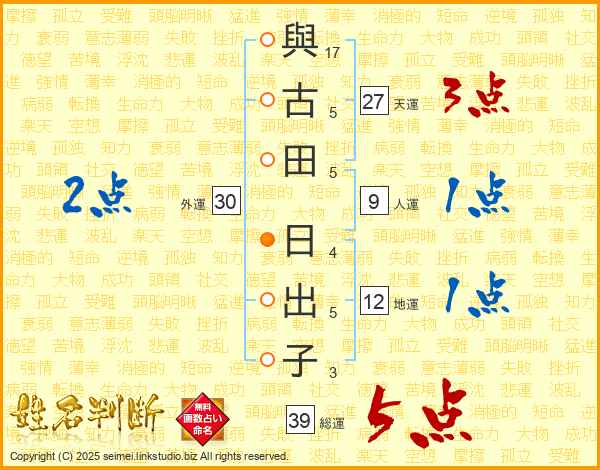 與(17画)古(5画)田(5画) 日(4画)出(5画)子(3画)