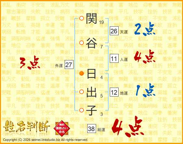 関(19画)谷(7画) 日(4画)出(5画)子(3画)