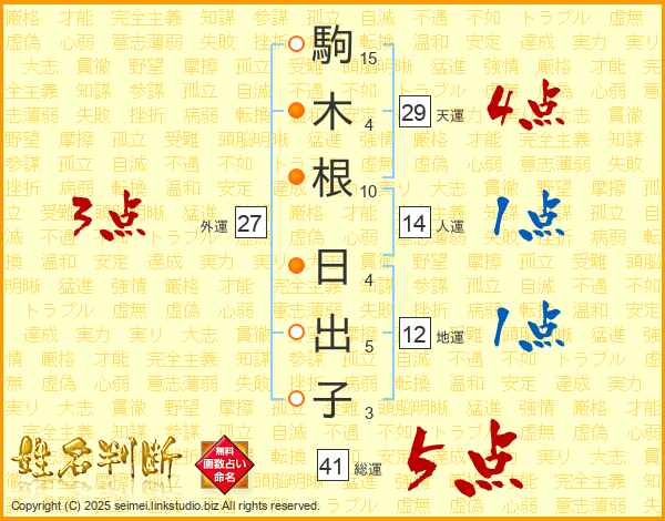 駒(15画)木(4画)根(10画) 日(4画)出(5画)子(3画)