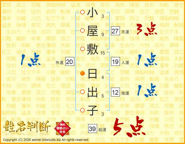 小(3画)屋(9画)敷(15画) 日(4画)出(5画)子(3画)