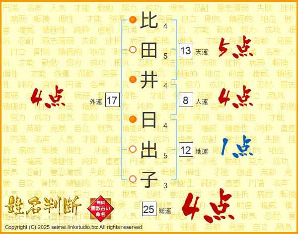 比田井日出子さんの総運は25画の4点