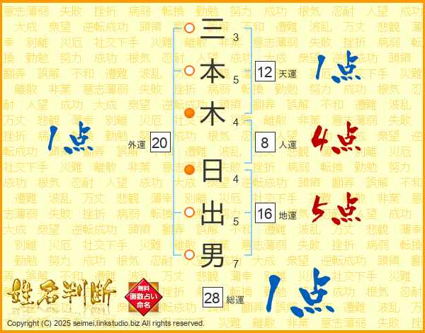 三(3画)本(5画)木(4画) 日(4画)出(5画)男(7画)