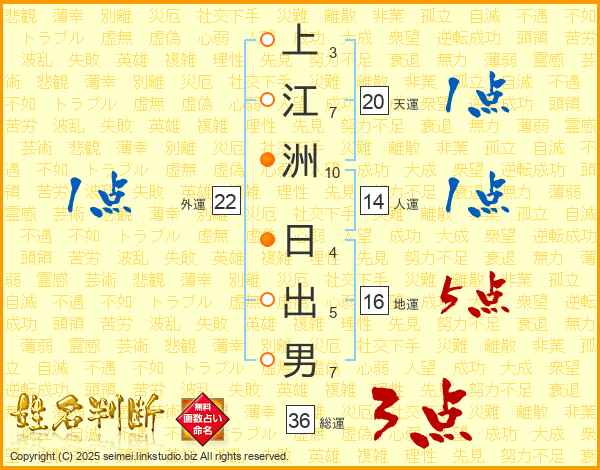 生活面を象徴する運勢です。外部から受ける影響力を表し、結婚運、家庭運や職場、環境への順応性を表します。総運から人運を引いた画数。姓や名が1文字の場合を除く。