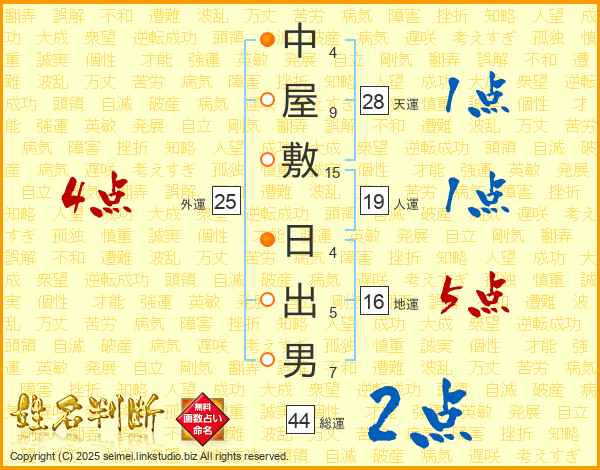 中(4画)屋(9画)敷(15画) 日(4画)出(5画)男(7画)