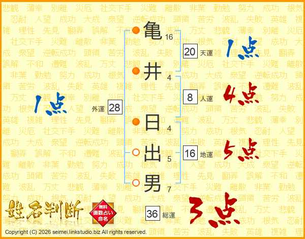 亀(16画)井(4画) 日(4画)出(5画)男(7画)