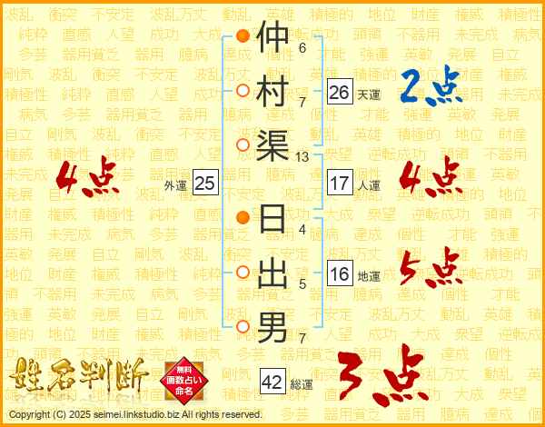 仲(6画)村(7画)渠(13画) 日(4画)出(5画)男(7画)