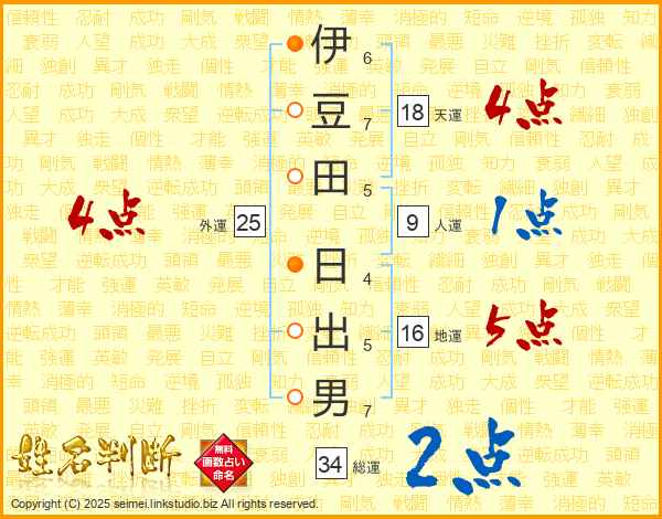 伊(6画)豆(7画)田(5画) 日(4画)出(5画)男(7画)