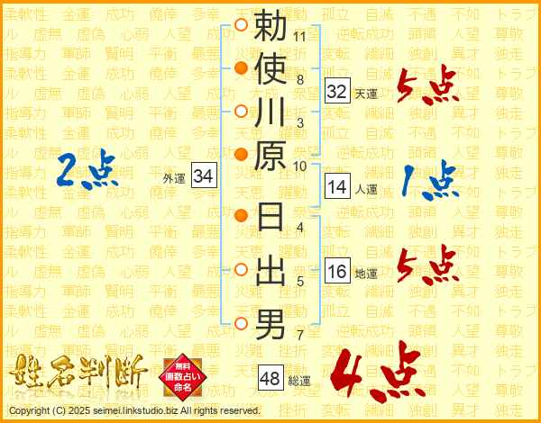 勅(11画)使(8画)川(3画)原(10画) 日(4画)出(5画)男(7画)