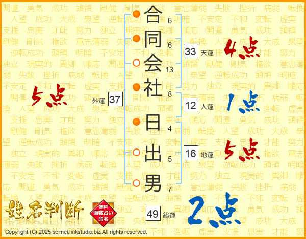 合(6画)同(6画)会(13画)社(8画) 日(4画)出(5画)男(7画)