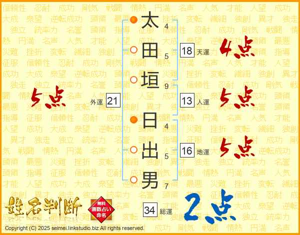 太(4画)田(5画)垣(9画) 日(4画)出(5画)男(7画)