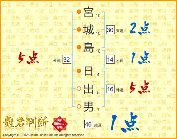 宮(10画)城(10画)島(10画) 日(4画)出(5画)男(7画)